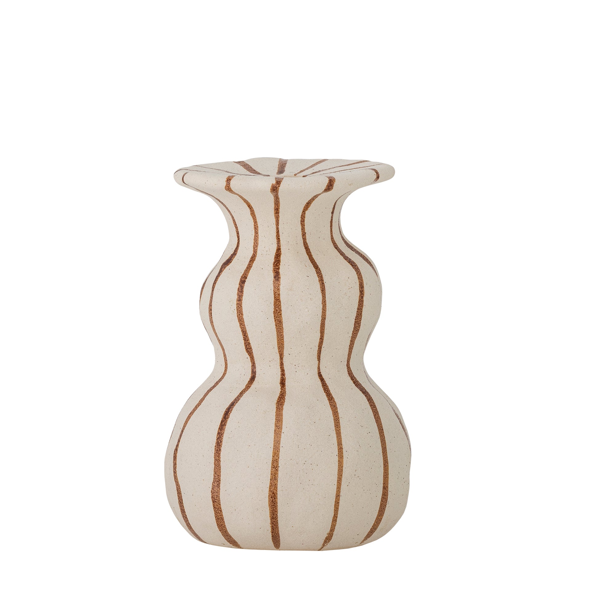 Der Byron Kerzenhalter von Creative Collection ist aus Steingut mit reaktiver Glasur gefertigt. Seine Silhouette erinnert an eine Sanduhr und zeigt wellenförmige braune Streifen auf sanftem Beige. Die matte, strukturierte Oberfläche verleiht dem Stück Tiefe und Charakter. Leichte Abweichungen in Muster und Farbintensität können auftreten – jedes Exemplar ist ein Unikat.