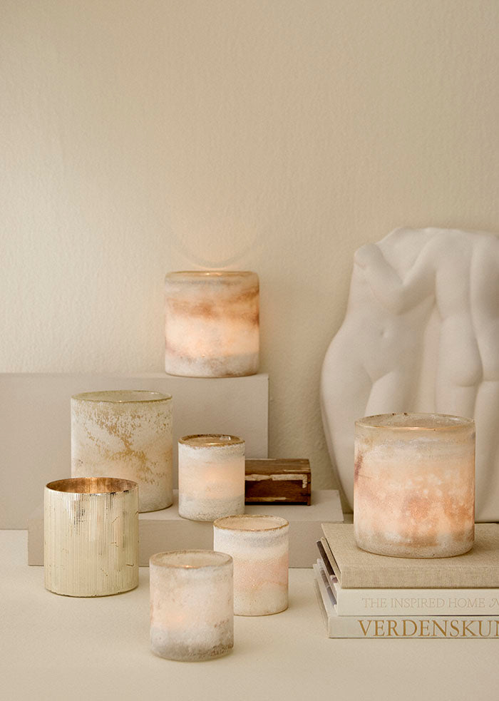 Votivkerze aus mundgeblasenem Glas mit rustikalen Details.