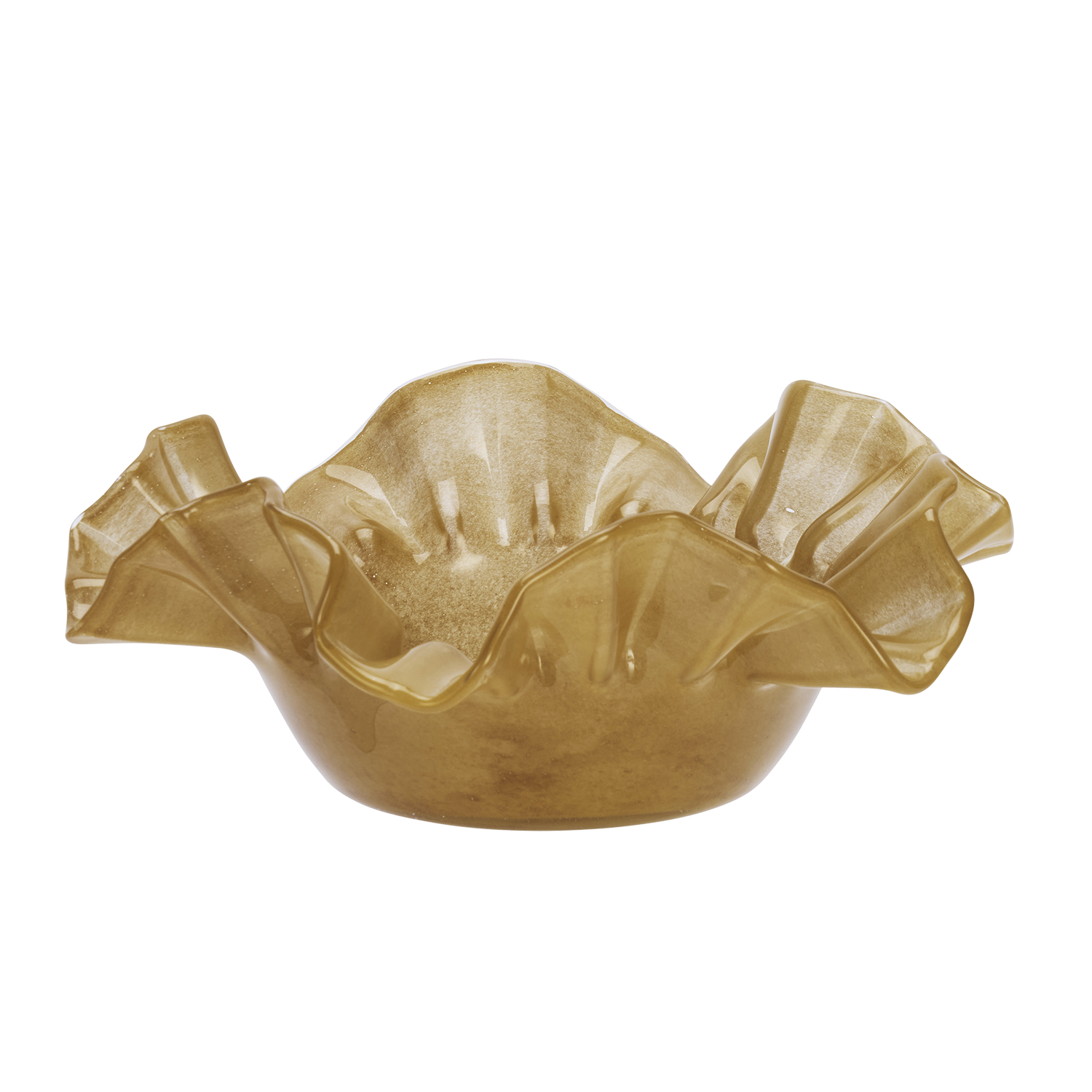 Diese von Art déco inspirierte Schale aus karamellfarbenem Glas vereint Funktionalität mit verspielter Eleganz. Sie wird in China gefertigt und eignet sich dank ihres gewellten Randes und des karamellfarbenen Farbtons ideal als Obstschale oder dekoratives Herzstück – eine Bereicherung für jede Sammlung.