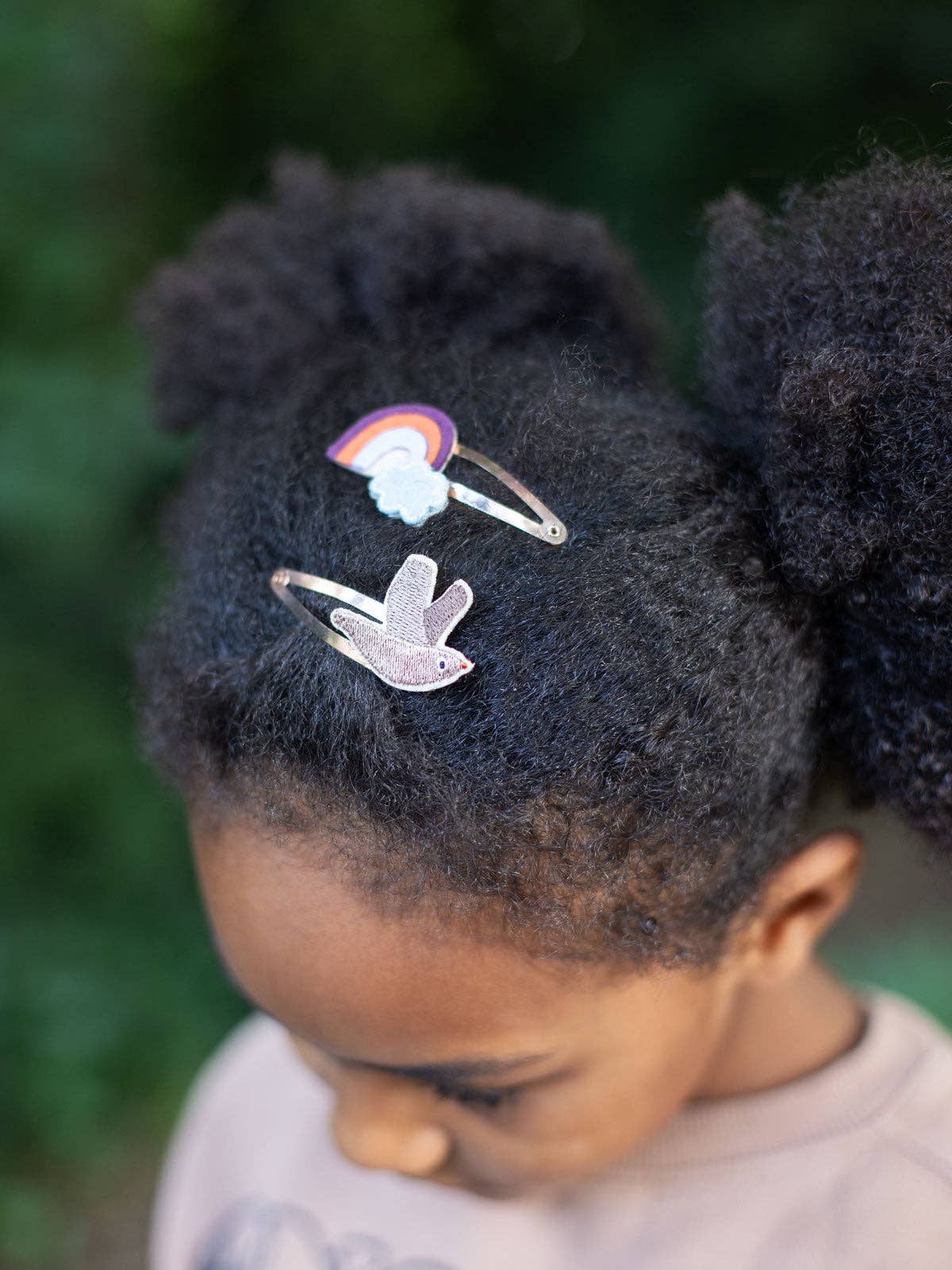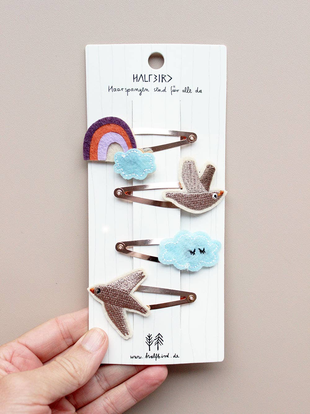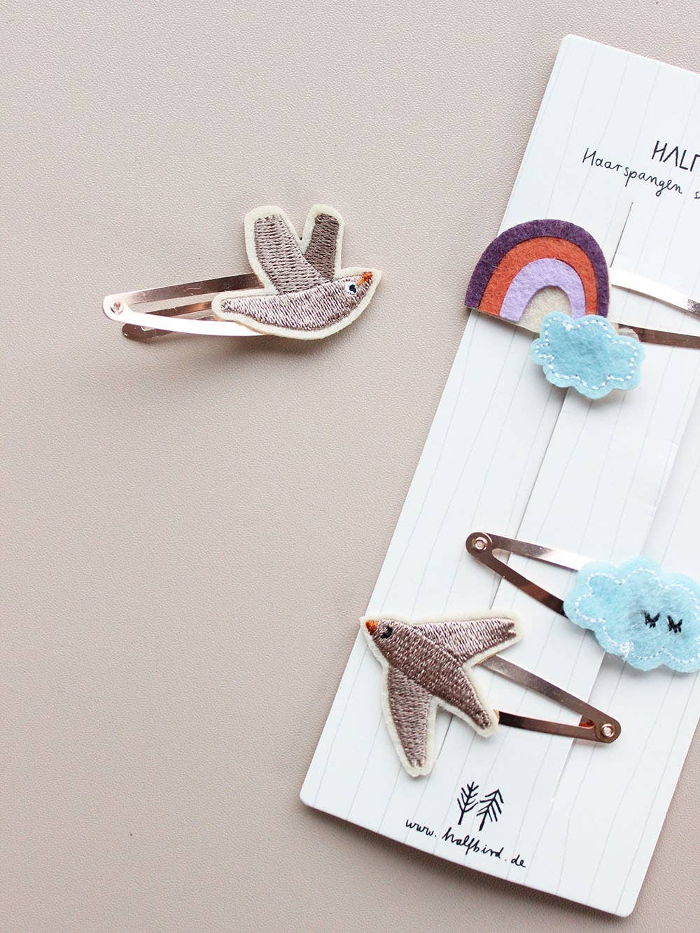Zartes rosegold gepaart mit der Leichtigkeit von Regenbogen und Vogel. Dieses Haarspangen Set bietet luftig fröhliche Leichtigkeit und hält jedes Haar stilvoll an Ort und Stelle. Die Spangen sind in rosegold was wunderbar mit dem beigen Stickerei der Vögel harmoniert.