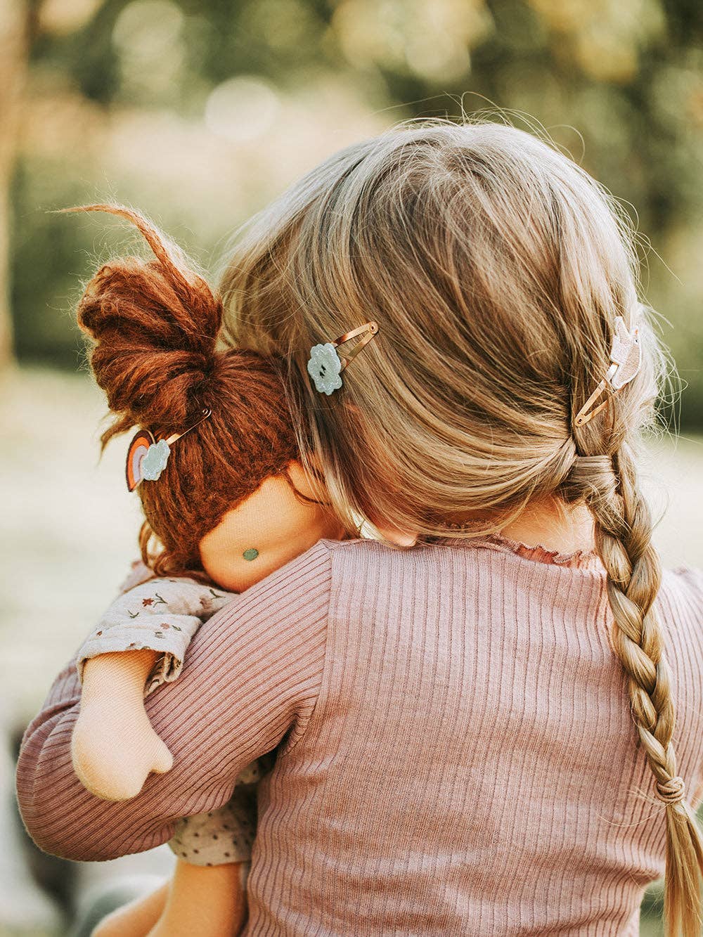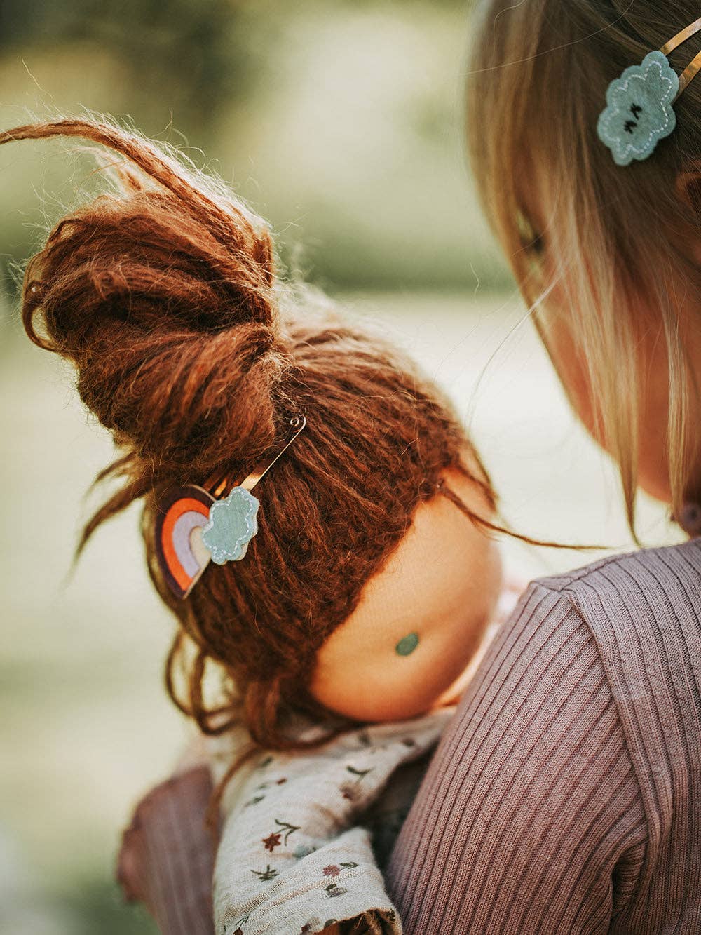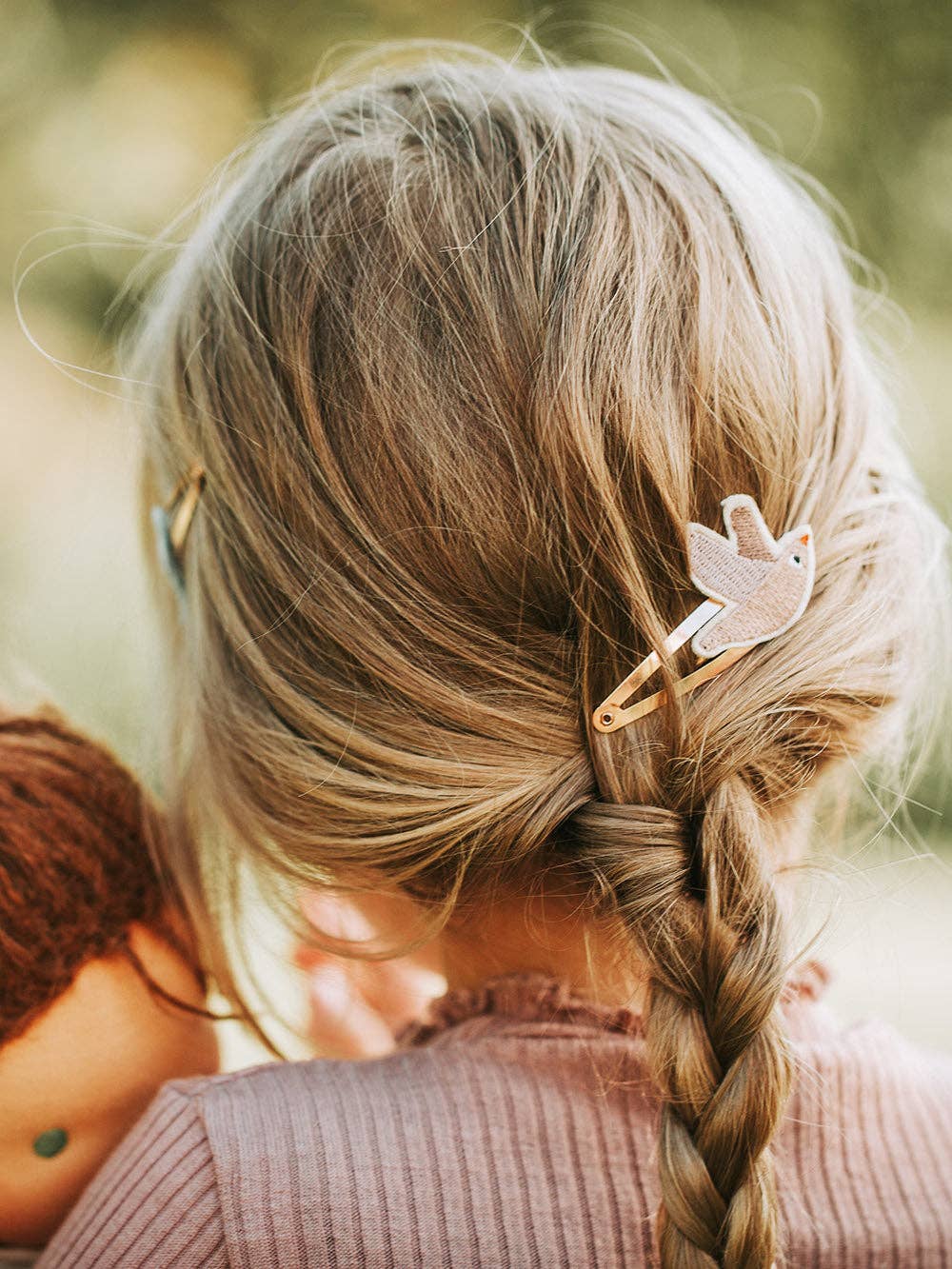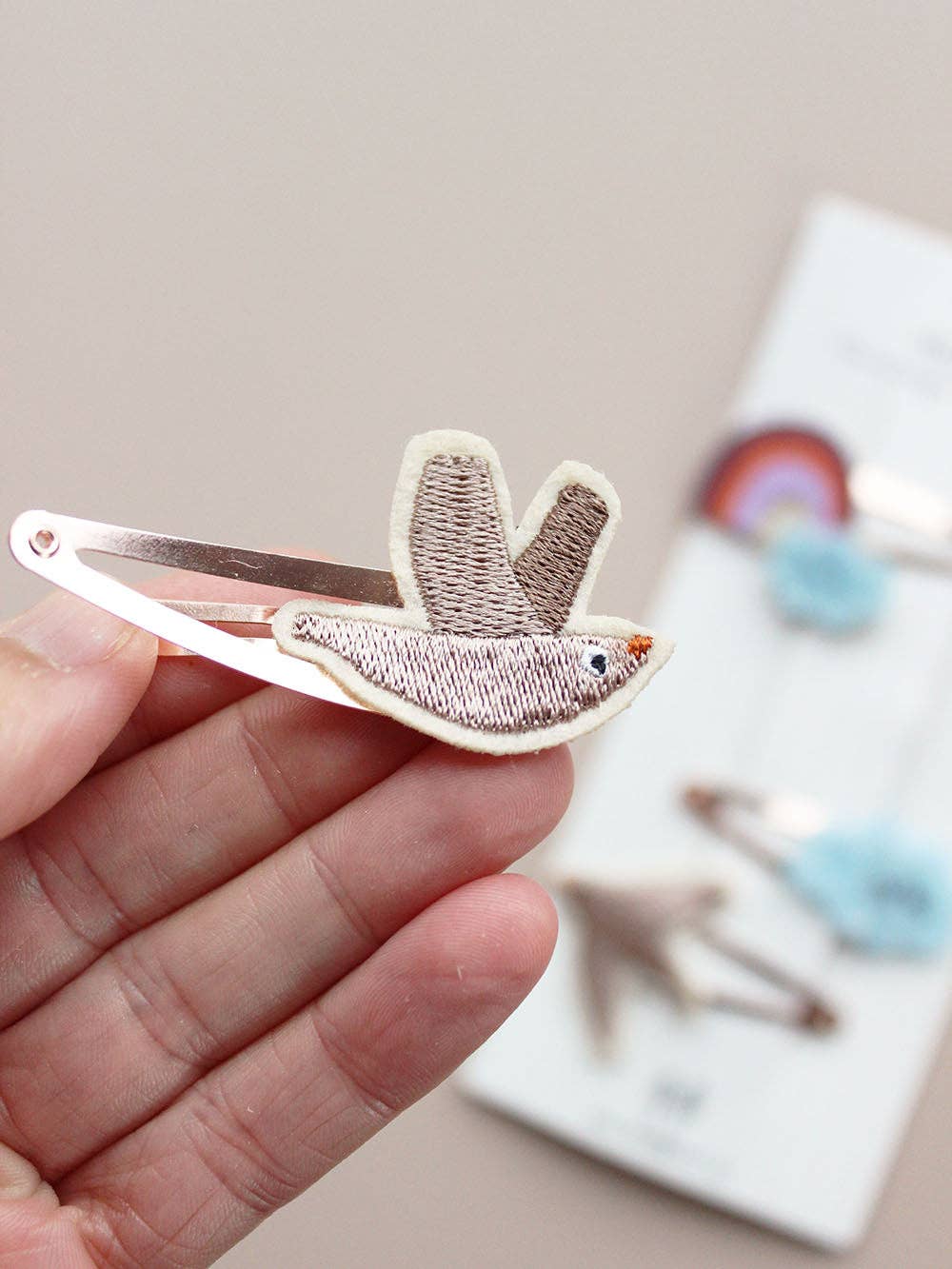 Zartes rosegold gepaart mit der Leichtigkeit von Regenbogen und Vogel. Dieses Haarspangen Set bietet luftig fröhliche Leichtigkeit und hält jedes Haar stilvoll an Ort und Stelle. Die Spangen sind in rosegold was wunderbar mit dem beigen Stickerei der Vögel harmoniert.