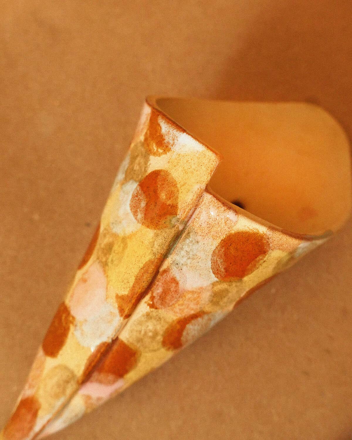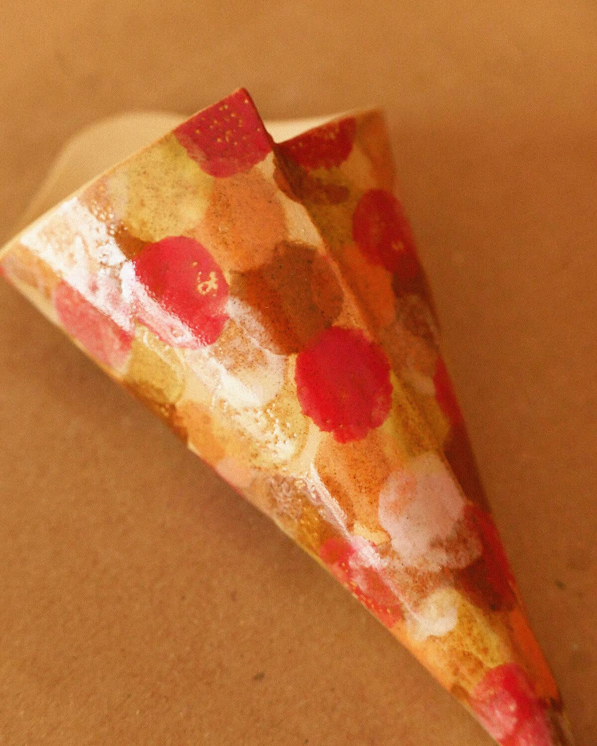 ⟶ DE FLEURS: Von Hand bemalt mit Punkten in Rot, Orange, Gelb, Braun und Rosa und innen mit transparenter Glasur glasiert.