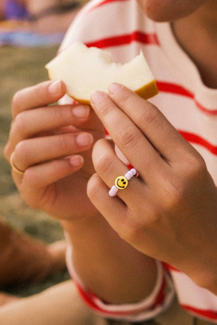 No time for bad vibes? Wir auch nicht, daher haben wir Dir einen superfröhlichen Begleiter kreiert. Die Glasperlen sind auf einem kräftigen und hochflexiblen Nylonfaden aufgereiht, somit schmiegt sich der Ring ganz wunderbar an Deinen Finger.