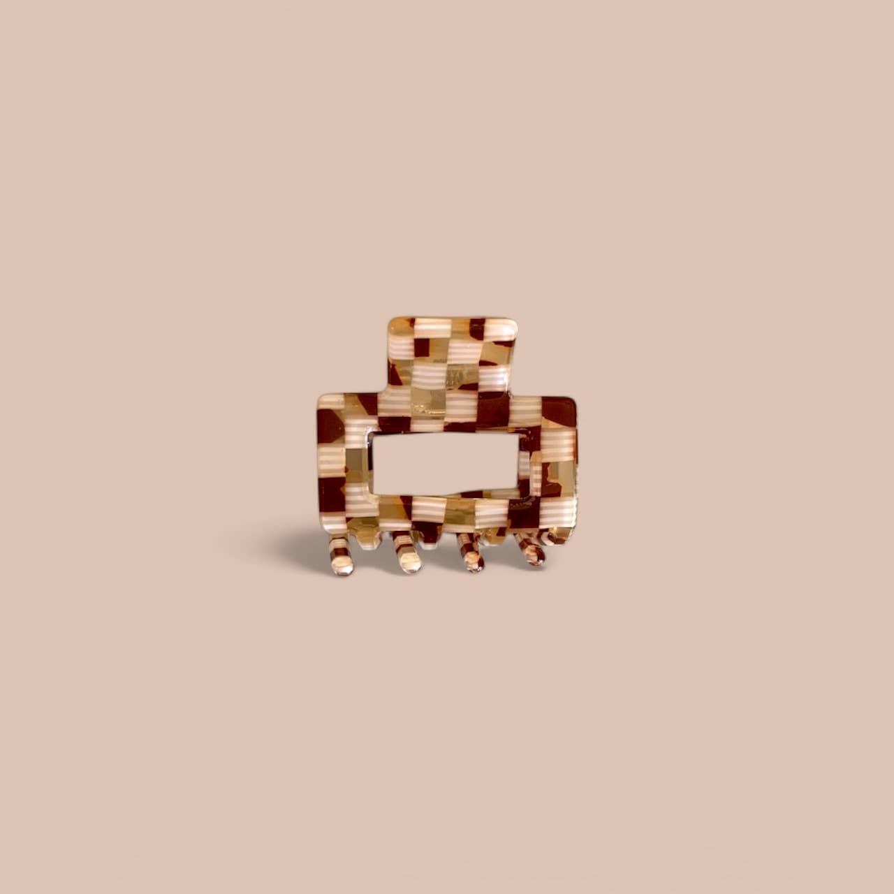Wir sind begeistert von dieser kleinen Haarspange mit braunem Karomuster, ideal, um Ihr Haar in einem halben Zopf zu binden oder widerspenstige Strähnen zu bändigen :)