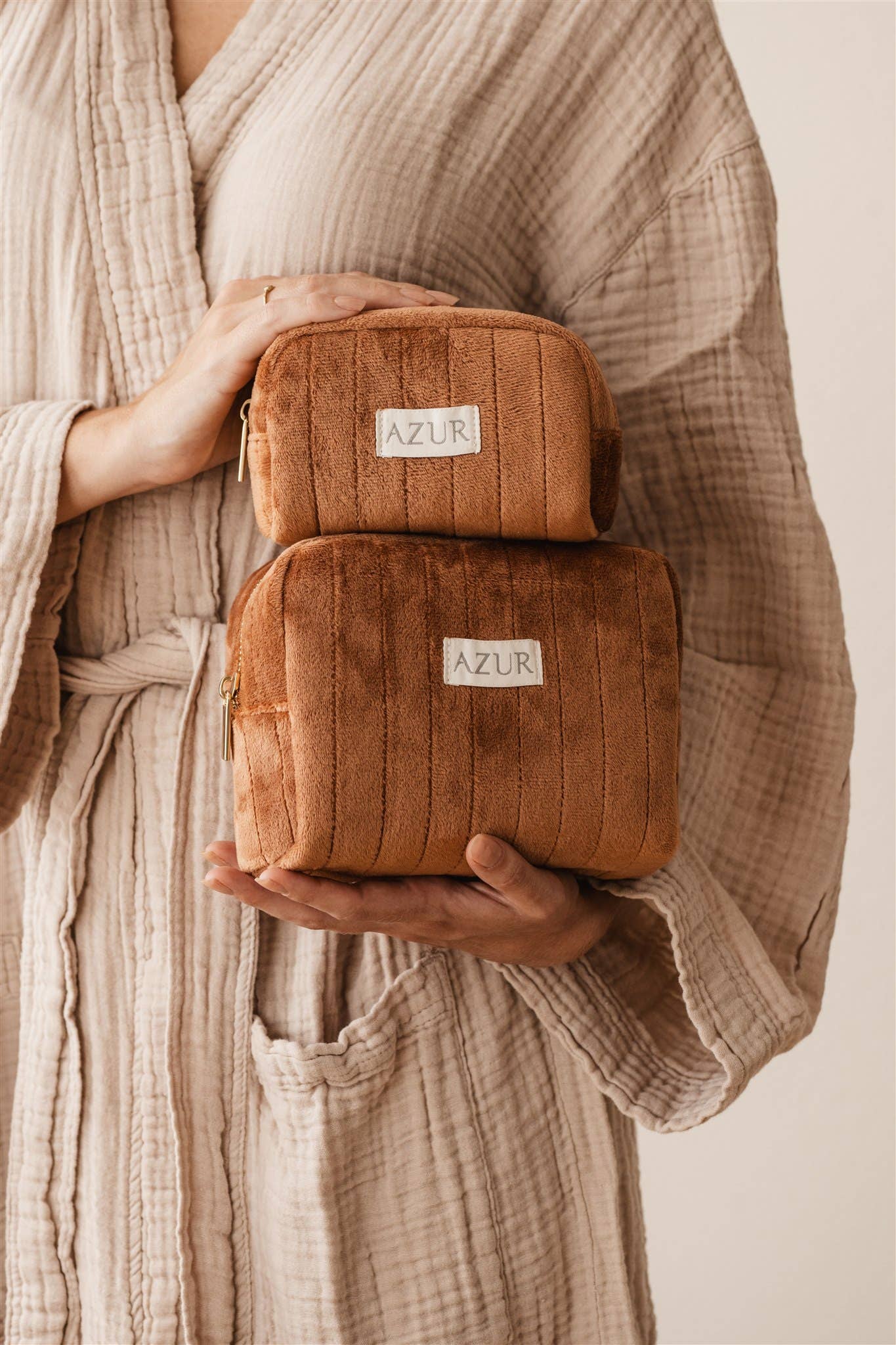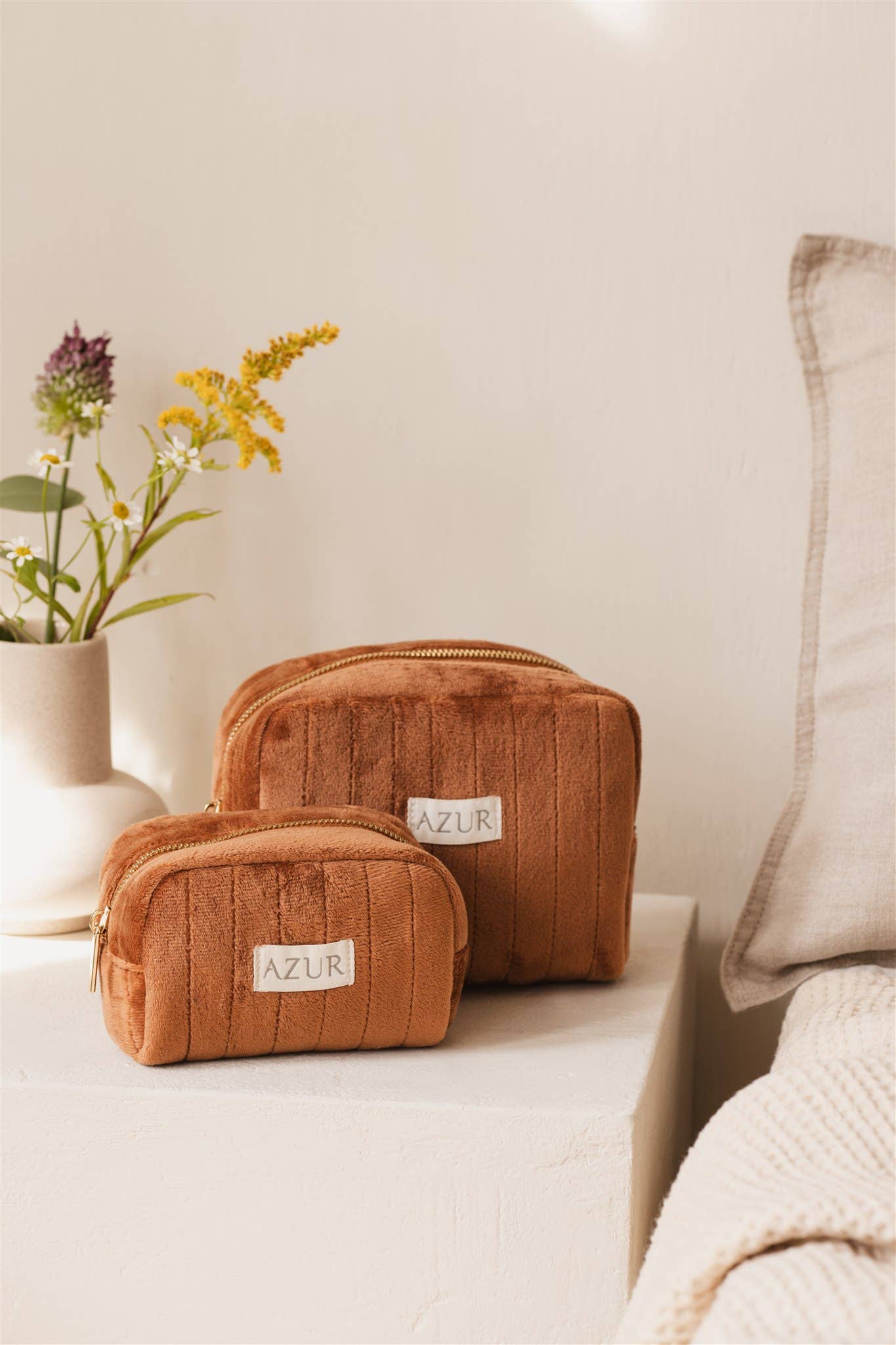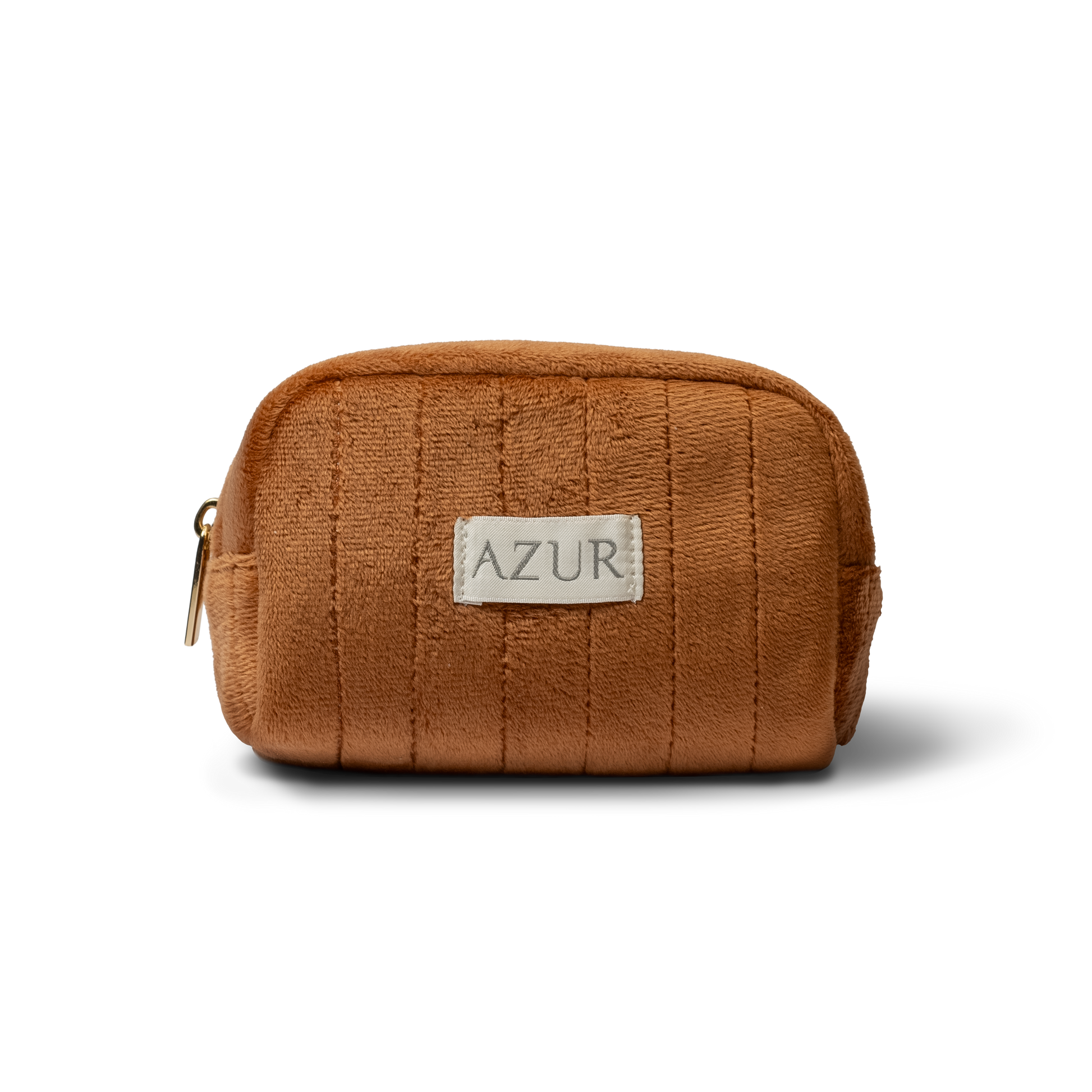 Exklusive, handgefertigte Azur Schminktasche. Die Tasche besteht aus weichem Baumwollsamt in einer schönen Rostfarbe. Die Tasche ist mit einem hochwertigen, goldenen Reißverschluss versehen. Die Tasche hat ein großes Fach mit zwei Seitentaschen auf der Innenseite. Auf diese Weise haben Sie alles wunderbar organisiert!